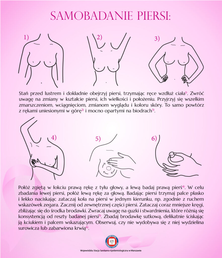Samobadanie piersi jest podstawowym elementem w procesie wczesnego wykrywania raka piersi. Składa się z dwóch etapów: oglądania stanu piersi oraz badania dotykowego, tzw. palpacji. Samodzielne badanie piersi należy wykonywać systematycznie, najlepiej w tej samej fazie cyklu miesiączkowego, tj. 2-3 dni po miesiączce, by wykluczyć nadwrażliwość brodawek i bolesność piersi, a w przypadku kobiet niemiesiączkujących raz w miesiącu.