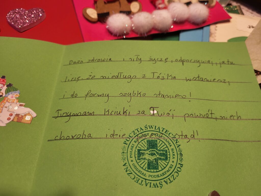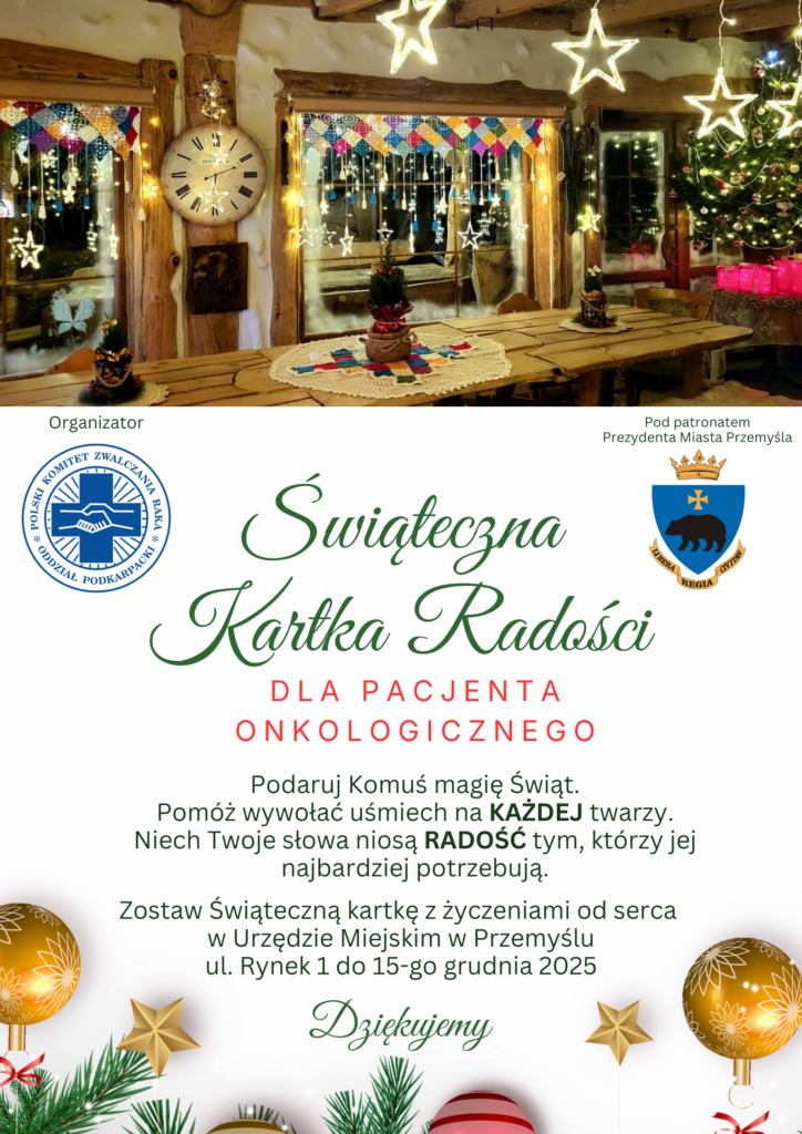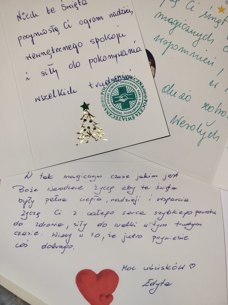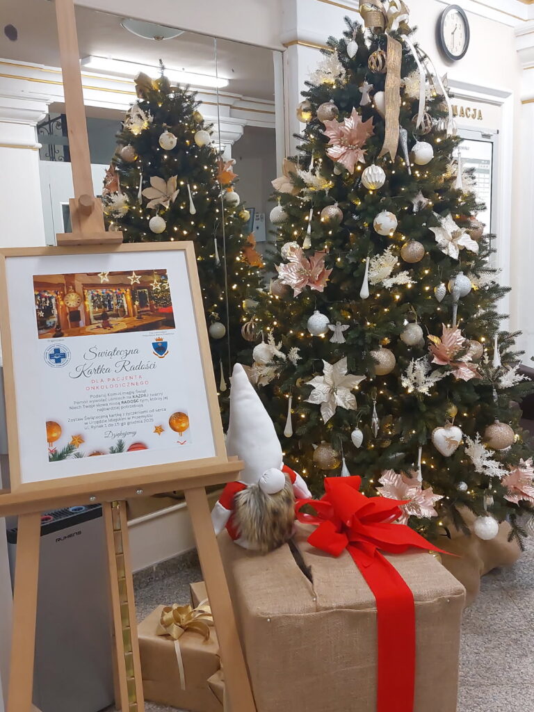 Każdy pomysł, by wesprzeć pacjentów onkologiczny jest dobry. Nie mogło zabraknąć miłego gestu w okresie Świąt Bożego Narodzenia. Dzięki wsparciu Prezydenta Miasta Przemyśla zorganizowaliśmy wśród mieszkańców miasta Przemyśla i okolic świąteczną akcję pisania życzeń dla pacjentów onkologicznych. W budynku Urzędu Miasta Przemyśla przy ulicy Rynek 1 przy pięknej choince przygotowana była specjalna paczka, do której można było wrzucić życzenia. Kartki wraz z życzeniami od serca 22 grudnia zostały przekazane przez członków naszego komitetu wraz z Panem Wiceprezydentem Miasta Przemyśla Krzysztofem Majcherem wszystkim pacjentom Oddziału Onkologicznego Wojewódzkiego Szpitala im. Św. Ojca Pio w Przemyślu. Nie obyło się bez wzruszeń, ale i mnóstwa uśmiechów u pacjentów i ich bliskich.