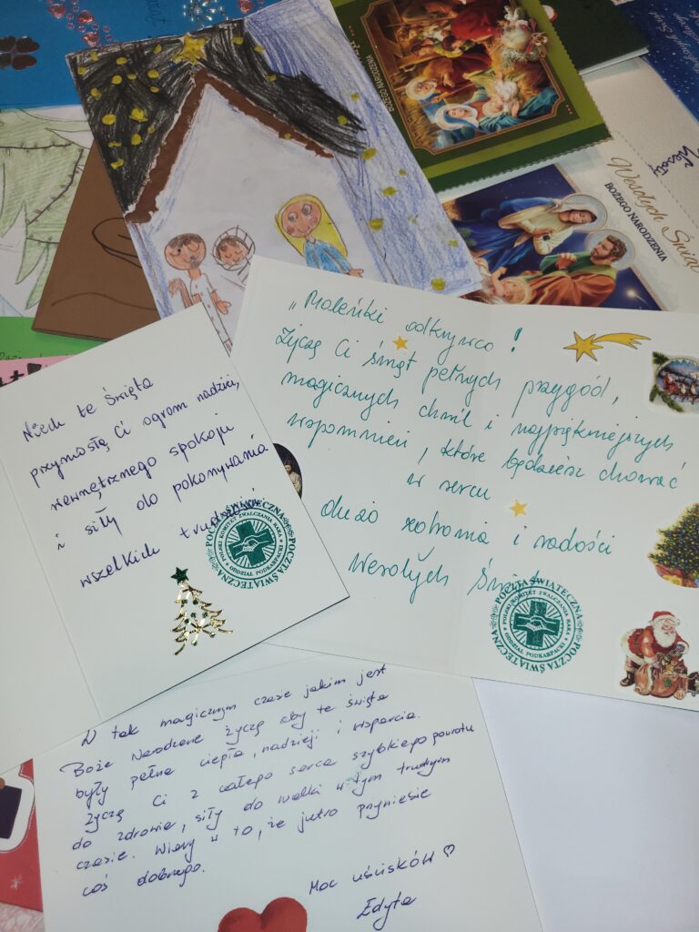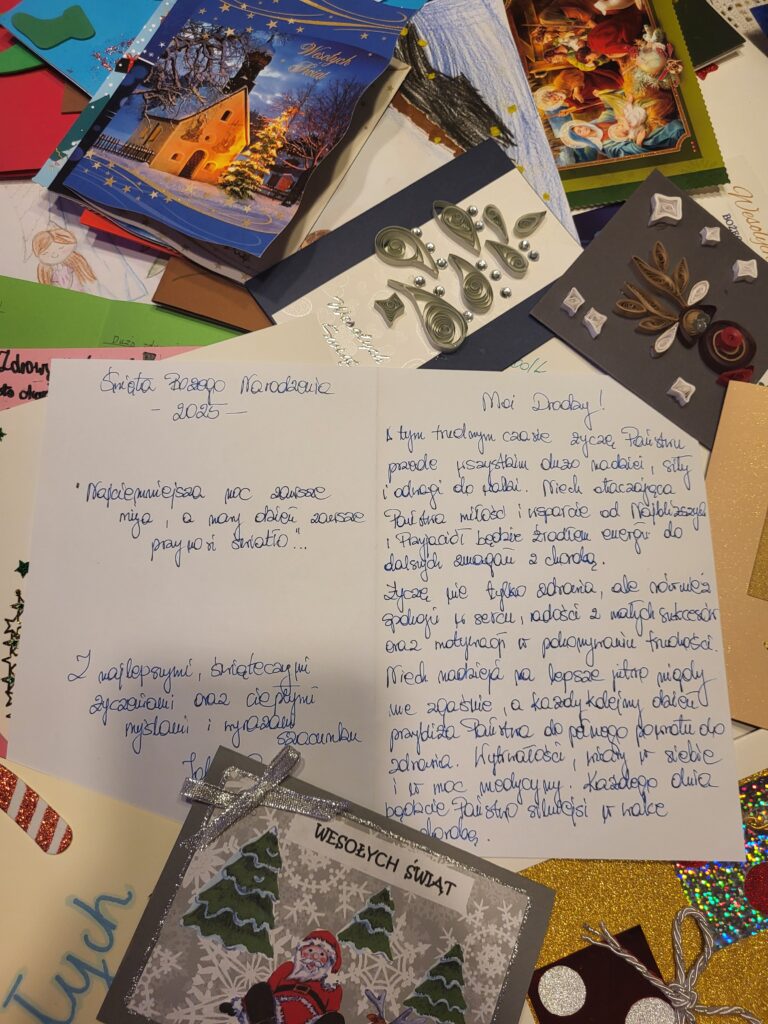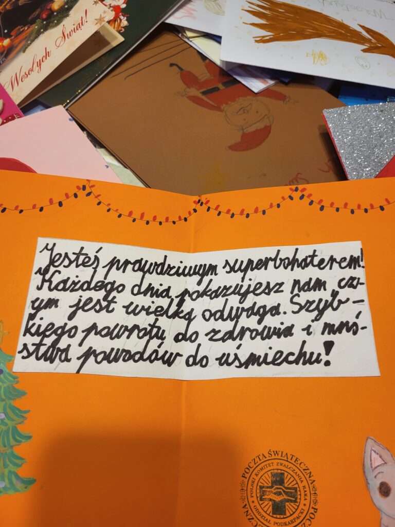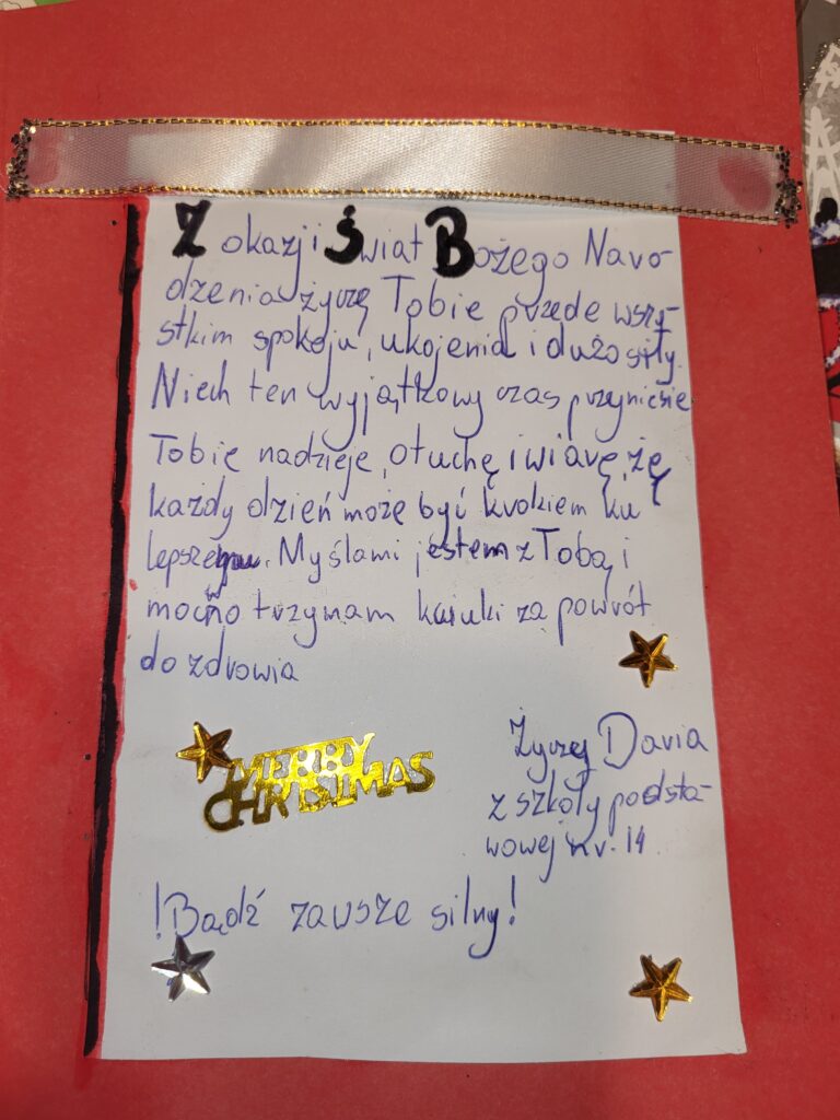 Każdy pomysł, by wesprzeć pacjentów onkologiczny jest dobry. Nie mogło zabraknąć miłego gestu w okresie Świąt Bożego Narodzenia. Dzięki wsparciu Prezydenta Miasta Przemyśla zorganizowaliśmy wśród mieszkańców miasta Przemyśla i okolic świąteczną akcję pisania życzeń dla pacjentów onkologicznych. W budynku Urzędu Miasta Przemyśla przy ulicy Rynek 1 przy pięknej choince przygotowana była specjalna paczka, do której można było wrzucić życzenia. Kartki wraz z życzeniami od serca 22 grudnia zostały przekazane przez członków naszego komitetu wraz z Panem Wiceprezydentem Miasta Przemyśla Krzysztofem Majcherem wszystkim pacjentom Oddziału Onkologicznego Wojewódzkiego Szpitala im. Św. Ojca Pio w Przemyślu. Nie obyło się bez wzruszeń, ale i mnóstwa uśmiechów u pacjentów i ich bliskich.